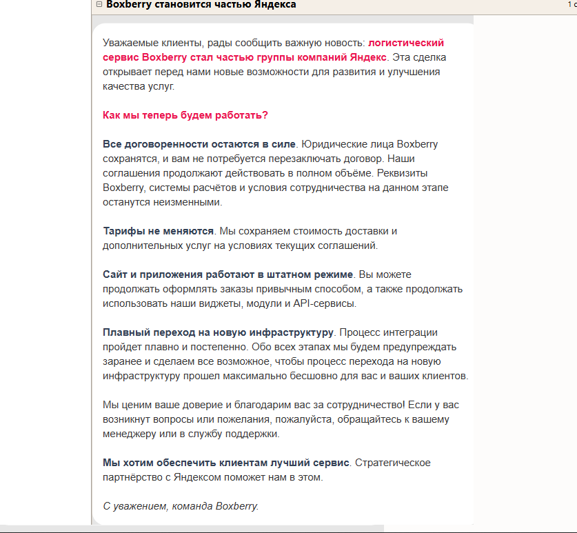 Что произошло? Пока есть только официальная информация от самого Boxberry, в которой они успокаивают своих партнеров. Дескать, не переживайте, для вас ничего не изменится. И тут встает вопрос, по какой причине Boxberry пошел на эту сделку? Действительно просто хочет оставить свой бренд но под крылом более сильной компании или просто в очередном порыве корпоративного альтруизма Яндекс решил спасти от неминуемого краха службу доставки Boxberry, объявив о её покупке? Официально — это стратегическое расширение логистической сети. Неофициально — очередной акт милосердия в стиле «купим всё, что плохо лежит». По версии «Яндекса», приобретение Boxberry — это прорыв в развитии их доставки, ведь теперь у них появится доступ к целым 20 новым регионам, включая Сибирь и Дальний Восток. Но давайте посмотрим правде в глаза: Вывод: если это «расширение», то очень скромное. Скорее, это попытка прикрыть тот факт, что Boxberry слишком долго была убыточной и явно нуждалась в спасении. Официальные заявлен