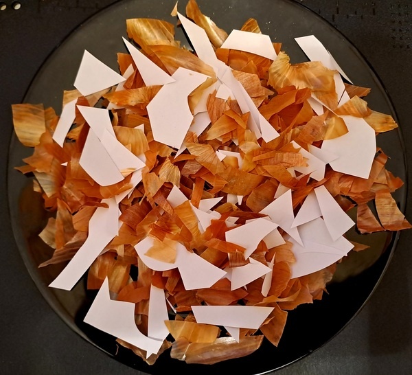 Нарезаем луковую шелуху и бумагу на произвольные, но не очень крупные кусочки в удобную миску и перемешиваем. Нарезаем марлю на квадратики примерно 15 на 15 см. в таком количестве, сколько вы собираетесь окрасить яиц. В этом рецепте их будет 7 штук.
