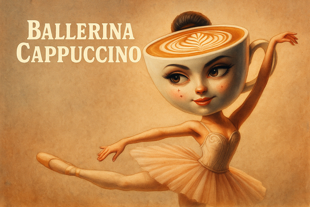 Она родилась не в кофейне. Не в балетной школе. Даже не в голове дизайнера с переутомлением. Она родилась между двумя зевками, в момент, когда бариста случайно налил в чашку слишком много экспрессии. И капучино — вспенилось. Ballerina Cappuccino — сущность утреннего вдохновения и нежной тревожности. Полусон. Полутанец. Полушанс. У неё чашка вместо головы, латте-арт на лбу, и вечно балетная осанка, будто она знает, что вот-вот встанет солнце — и надо быть к этому готовой эстетически. — Мадам, вы откуда? — спросил однажды турист, увидев её в 5 утра, вращающуюся на перроне. — Из внутреннего монолога, — сказала она и продолжила па. В раннем возрасте Ballerina Cappuccino мечтала быть кем-то простым. Типа салфеткой. Или ложечкой. Но судьба была другой. Она с ранних лет начала крутиться — сначала в кружке, потом в танце. — Мама, я хочу быть в спокойствии! — Ну тогда ты не капучино, — отвечала пенка. Да. Он существует. Темноватый. Горький. С шрамом из корицы и взглядом как у того, кто видел,