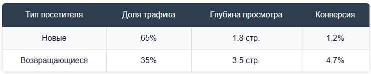 - Анализ поведения – сравнение новых и возвращающихся пользователей.