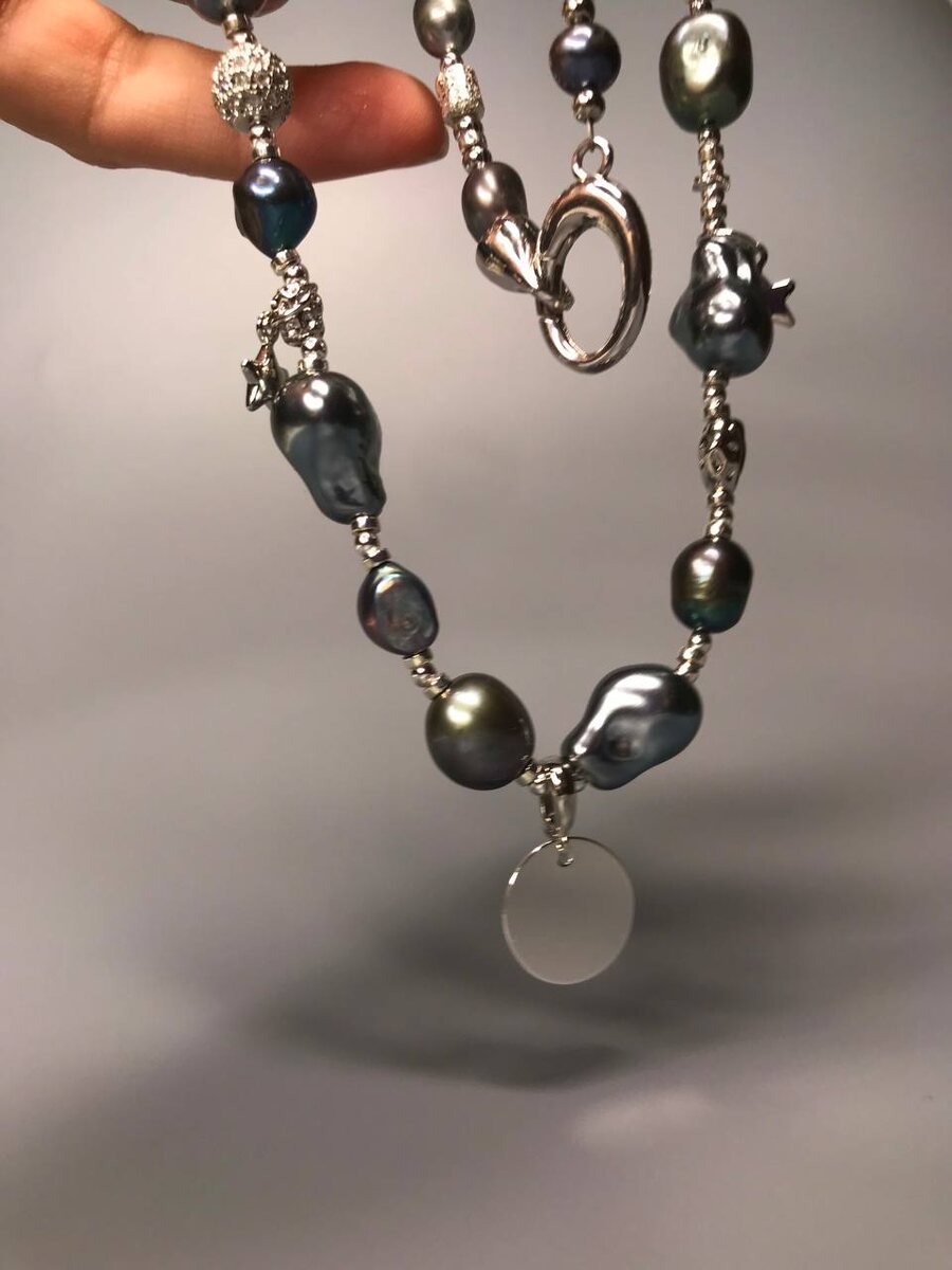 Стильное колье-чокер из натурального жемчуга со стальным оттенком и барочной Майорки. Фурнитура с родиевым покрытие надёжная и гиппоаллергенная. Подвески и элементы разной формы дополняют жемчуг, делая колье стильным, игривым и современным. Длина 44 см, 6500₽ Di-Di