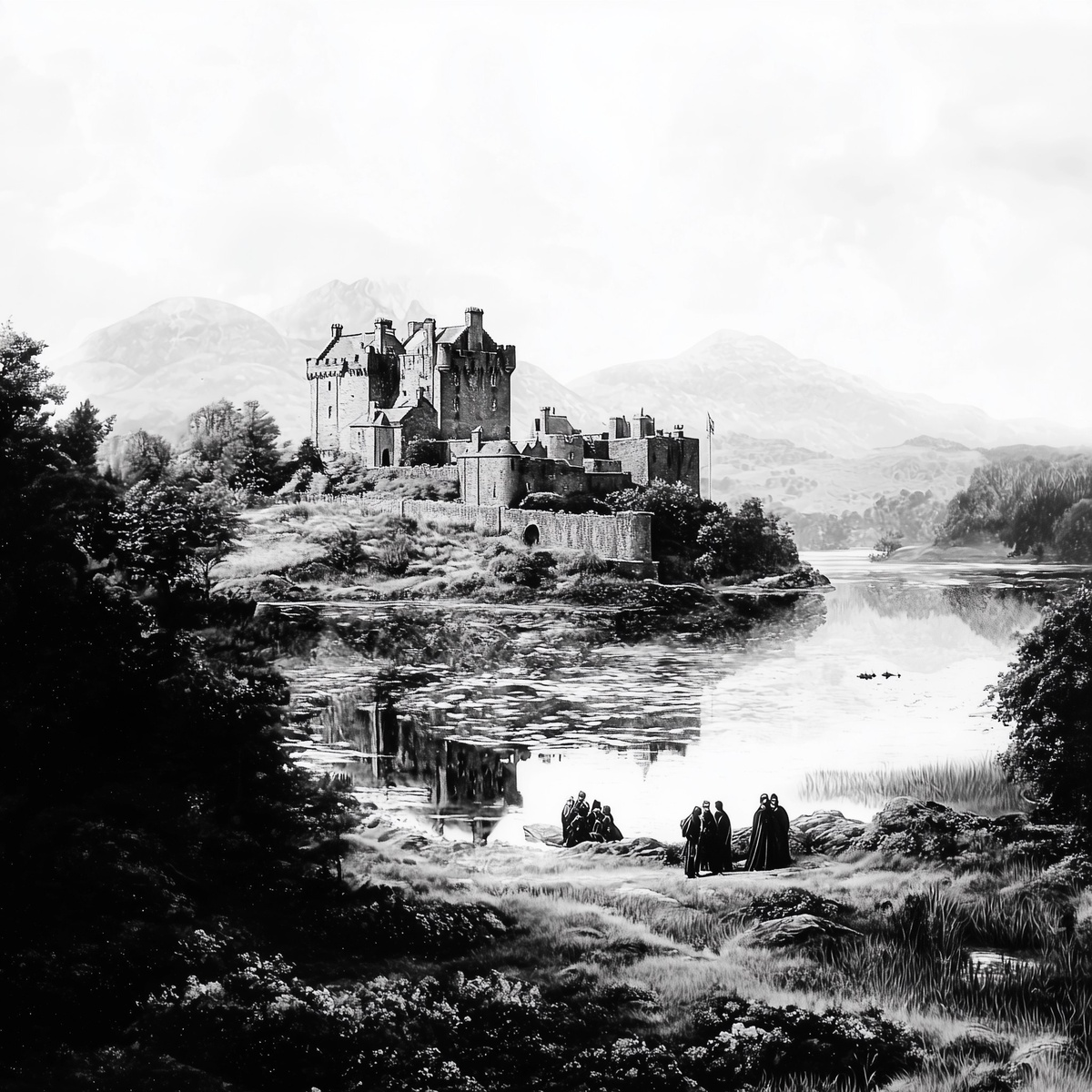 Создано на основе запроса: the black and white intricate engraving of the landscape castle at the Loch Lake in the style of Steven Noble