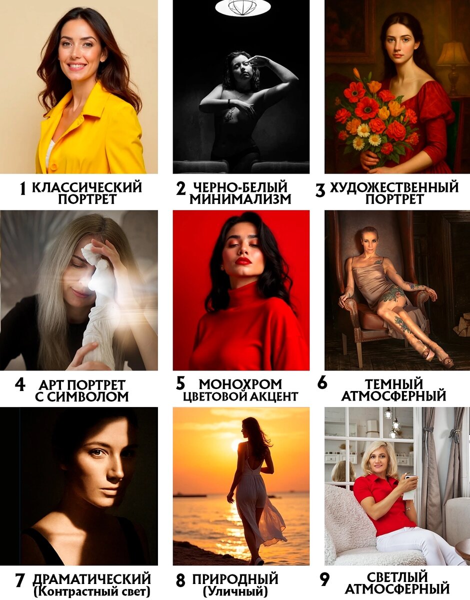 📸 ОСНОВНЫЕ СТИЛИ ФОТОСЪЁМКИ 📸 Ты хочешь фото, которое работает на твоё имя, проект, задачу. Я снимаю так, чтобы кадр был точным. Чётким. Про тебя. Ниже — 9 стилей. Выбери тот, который подойдёт под задачу — и напиши мне. ⚡1. Классический портрет 🔹 Суть: Чистый фон, ровный свет, акцент на лице и позе. 👤 Для кого: Для тех, кто хочет универсальный, профессиональный портрет — для резюме, сайта, презентации. Мотивация: Показывает тебя собранной, уверенной, без излишней драматургии. ⚡2. Чёрно-белый минимализм 🔹 Суть: Фокус на чертах, взгляде, контрасте. Без цвета — остаются только свет, тень и суть. 👤 Для кого: Для тех, кто ценит лаконичность и хочет показать глубину. Мотивация: Такие кадры — как чёткая мысль. Их не пролистывают. ⚡3. Художественный портрет 🔹 Суть: Свет, композиция, образ. Кадр с настроением — как в кино или на картине. 👤 Для кого: Тем, кто хочет выразительный портрет с атмосферой и характером. Мотивация: Такой снимок работает как визуальный рассказ. Сильная подача