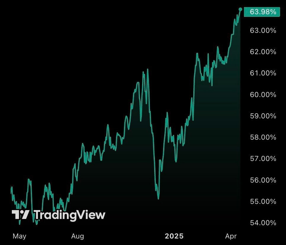 Доминирование биткоина на крипторынке достигло 4-летнего максимума.