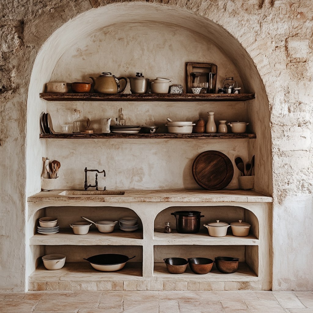 Создано на основе запроса: a rustic Meditteranean kitchen with biege washed walls. The focus should be a zoom in image of an Archway shelves. the arch is cut into the wall with shelves inside. The shelves have pots and pans on them --- Автоперевод: деревенская медитетерна -кухня с вымытой бифе. Интересно выглядит? 🤔 https://dzen.ru/id/65c0c65c86e4f837c27b24d7 #ИИ #AI #нейросеть #midjourney #art
