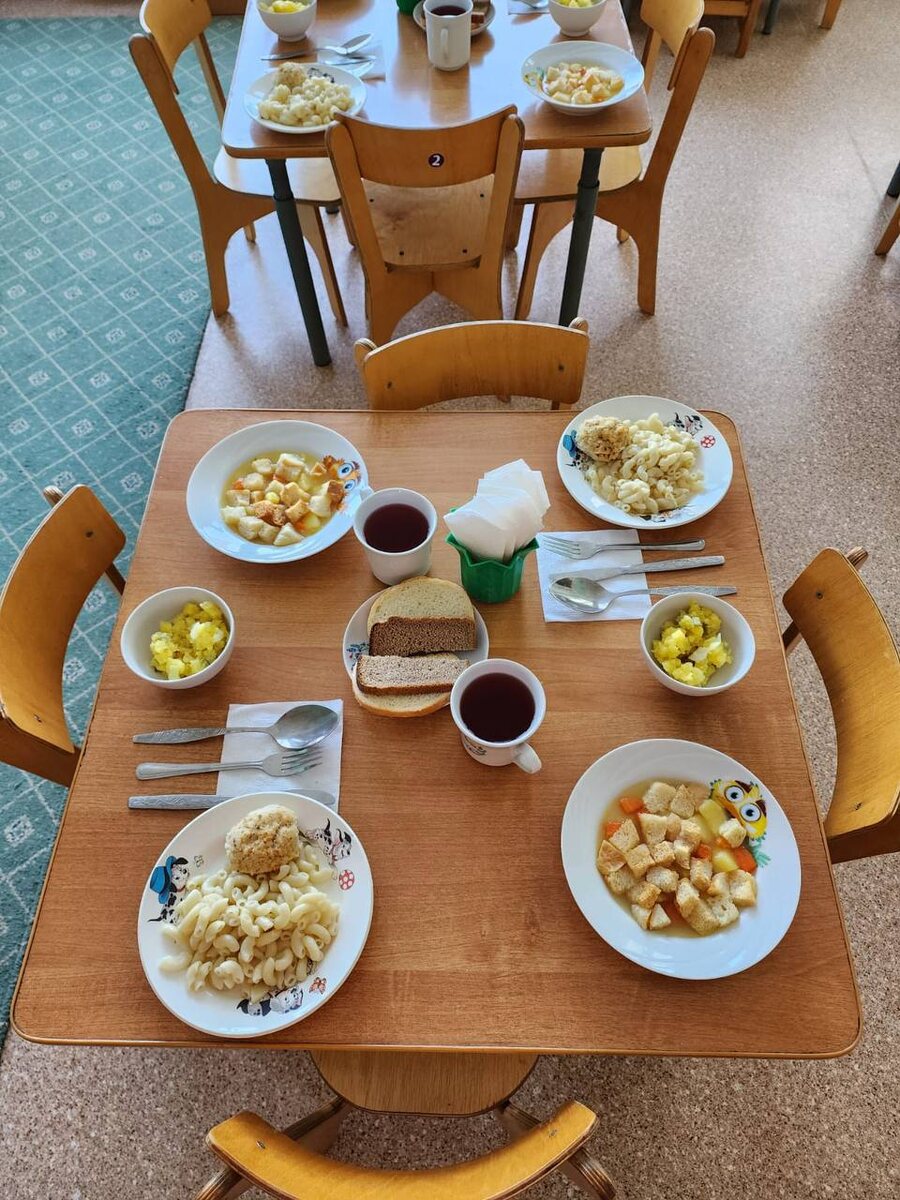 ОБЕД В ДЕТСКОМ САДУ ✔️Сегодняшнее меню в наших дошкольных отделениях порадует наших ребят разнообразием и питательностью. 📌Каждое блюдо в меню — это кладезь полезных веществ. На первое — ароматный суп с картофелем, горохом и морковью. К нему подаются хрустящие сухарики из пшеничного хлеба. Такой суп укрепляет пищеварение благодаря клетчатке, а морковь и лук насыщают организм витаминами А и С. На второе ребят ждут нежные рубленые котлеты из филе минтая, богатые белком, важные для развития мозга и зрения, а также рассыпчатые отварные макароны. Картофельный салат с растительным маслом поддерживает работу сердца, а вишнёвый напиток с натуральным сахаром борется с усталостью и укрепляет иммунитет. И, конечно, на столе всегда есть свежий пшеничный и ржано-пшеничный хлеб — источник энергии и клетчатки. 💯Такой рацион помогает расти крепкими и активными, а вкусные и полезные блюда учат малышей ценить разнообразие продуктов и понимать их пользу для организма. #Школа1900 #ДОНМ #НашеПитание