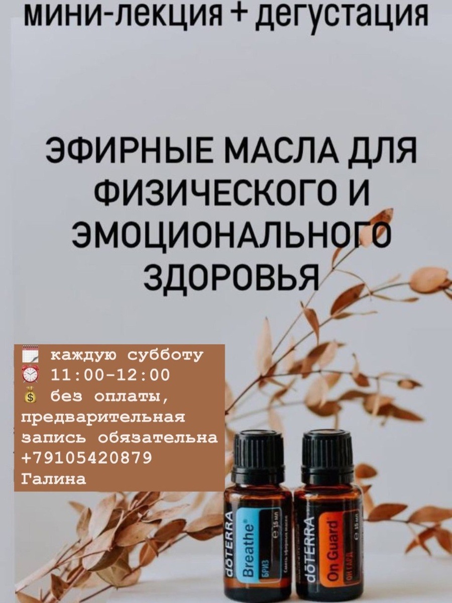 👥Каждую субботу с 11:00 до 12:00 в кофейне «Библиотека» будут проходить аромавстречи. В формате мини-лекции и дегустации, вы узнаете: - почему эфирные масла действуют быстро и эффективно - как и какие масла использовать для поддержки иммунной системы детям и взрослым - какие масла помогают при эмоциональной нагрузке - с какими маслами легче концентрироваться ❗Участие бесплатное. Предварительная запись обязательна +7 (910) 542-08-79, Галина Сухова. Обнинск, ул. Белкинская, 25. 👍 Подписаться | Прислать мероприятие