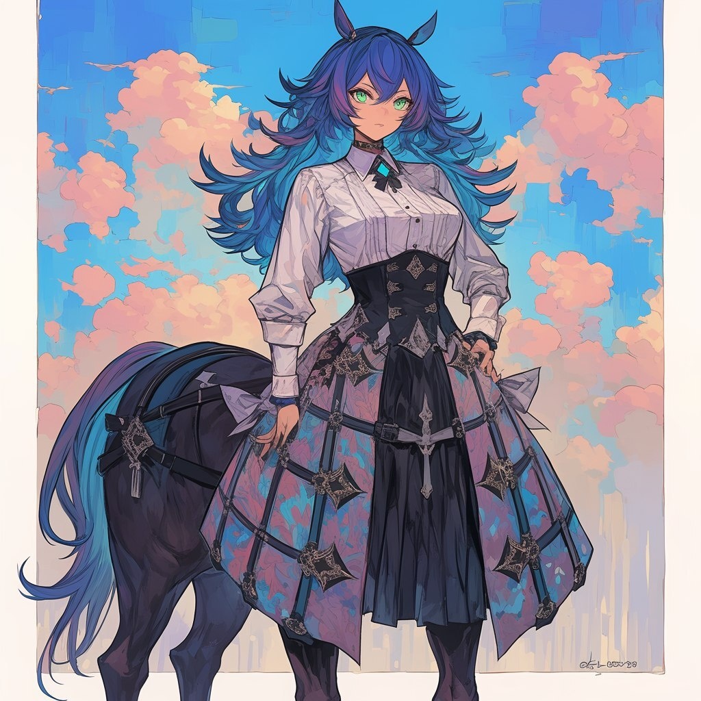Создано на основе запроса: A full-length centaur girl stands in a top and skirt, with a bow on her head, a choker on her neck, blue hair and