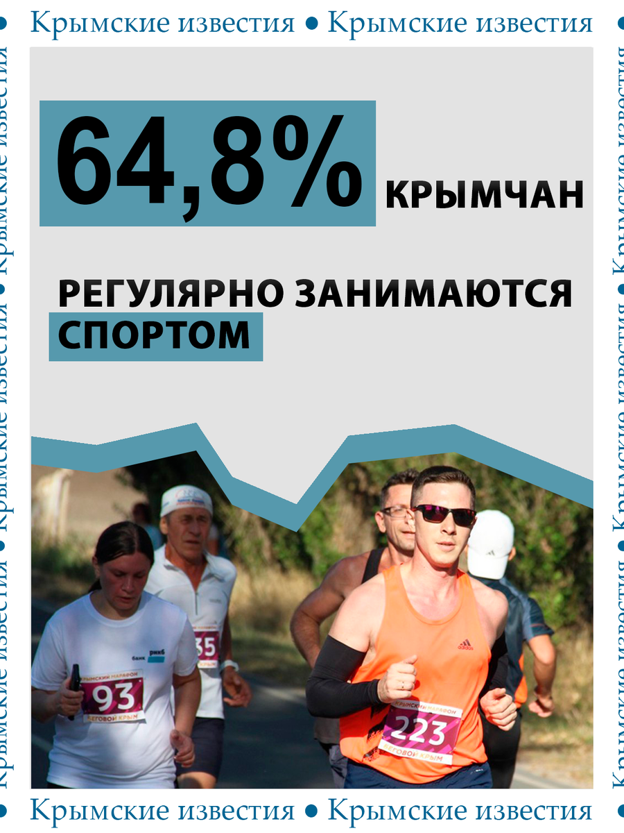 Каждый третий крымчанин регулярно занимается спортом. Доля жителей региона, которые постоянно занимаются какими-либо видами спортивной активности достигла 64,8%, превысив плановый показатель на 9,3%, сообщили в пресс-службе Госсовета Крыма. Особое внимание в республике уделяют развитию детского и юношеского спорта, а также проведению соревнований для ветеранов спецоперации. К примеру, сейчас в Крыму работает 28 центров тестирования на нормативы ГТО. В минувшем году в городах и сёлах республики построили три «умные» спортплощадки и восемь многофункциональных, физкультурный комплекс в Судаке и установили 103 теннисных стола. Напомним: в 2024-м самым спортивным городом Крыма стала курортная Ялта. Физкультурой там занимаются почти 82 тыс человек, а это около 69% от населения. Крымские известия. Больше новостей Telegram | Вконтакте | Одноклассники