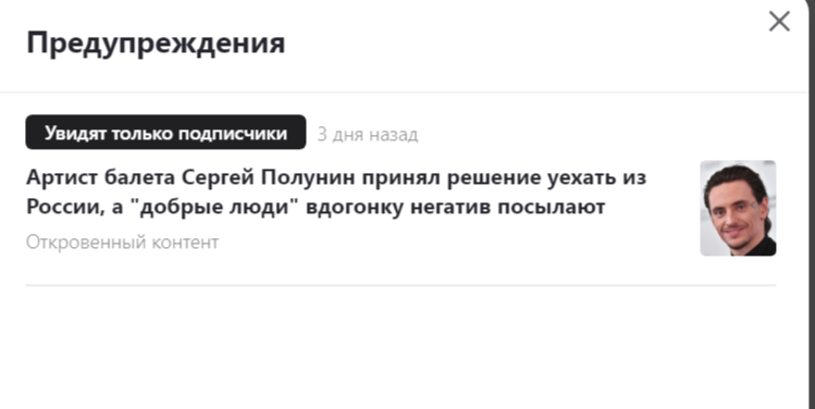 Я не планировала писать отдельную статью, потому что текста немного, думала, что ограничусь постом. Однако возникли сложности с оформлением: редактор не выделяет заголовок, не применяет шрифты и ограничивает количество изображений. Зачастую многие пишут, что бывает нереально мало показов, просто за сутки около 10-30. Я -то вроде собаку съела уже на всяких несовершенствах Дзена и прочих проблемах, но полностью познать логику и суть алгоритмов, и знать ответы на все вопросы - это нужно быть создателем или администратором, а для автора - это конечно утопия :) Ну я загнула, да, не собаку съела конечно, хвост только :) Тем не менее, в моменты, когда мои статьи ограничивали за нарушения правил, (не всегда, кстати обоснованно), показы соответственно были ничтожными. Если алгоритм поймал статью на нарушении, то в адрес автора канала приходит Предупреждение и выглядит так: Я разместила фотографию, на которой артист балета был запечатлён в трико и с обнажённым торсом на сцене. Подобные снимки ч