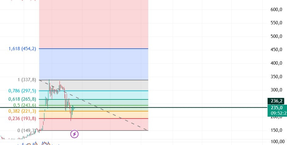 $SPBE СПБ Биржа находиться в глобально восходящем тренде. В краткосрочном тренде это уже нисходящий. 🕯По волнам Эллиотта, видим СПБ Биржа начала строить третью волну Эллиотта, которая вероятно должна будет дойти до 457. Между тем, есть вероятность, что это все еще вторая волна, так как по технике, она должна быть длиннее. ✅На пути третьей волны будут сильные уровни сопротивления на 246.7, 268.4, 300.4 и 340.9. При пробитии уровня сопротивления 300,4 будет подтверждением третьей волны и роста к цели указанной выше. ↗️ Однако, при пробитии сильного уровня поддержки 224.1, пойдем вниз до 196.8. При пробитии этого уровня вышеуказанный график, с ростом, будет сломан. Не рассматриваю данный актив для покупки, так как много неопределенности в движении цены. НЕ ИИР #теханализ #трейдер #инвестиции #SPBE