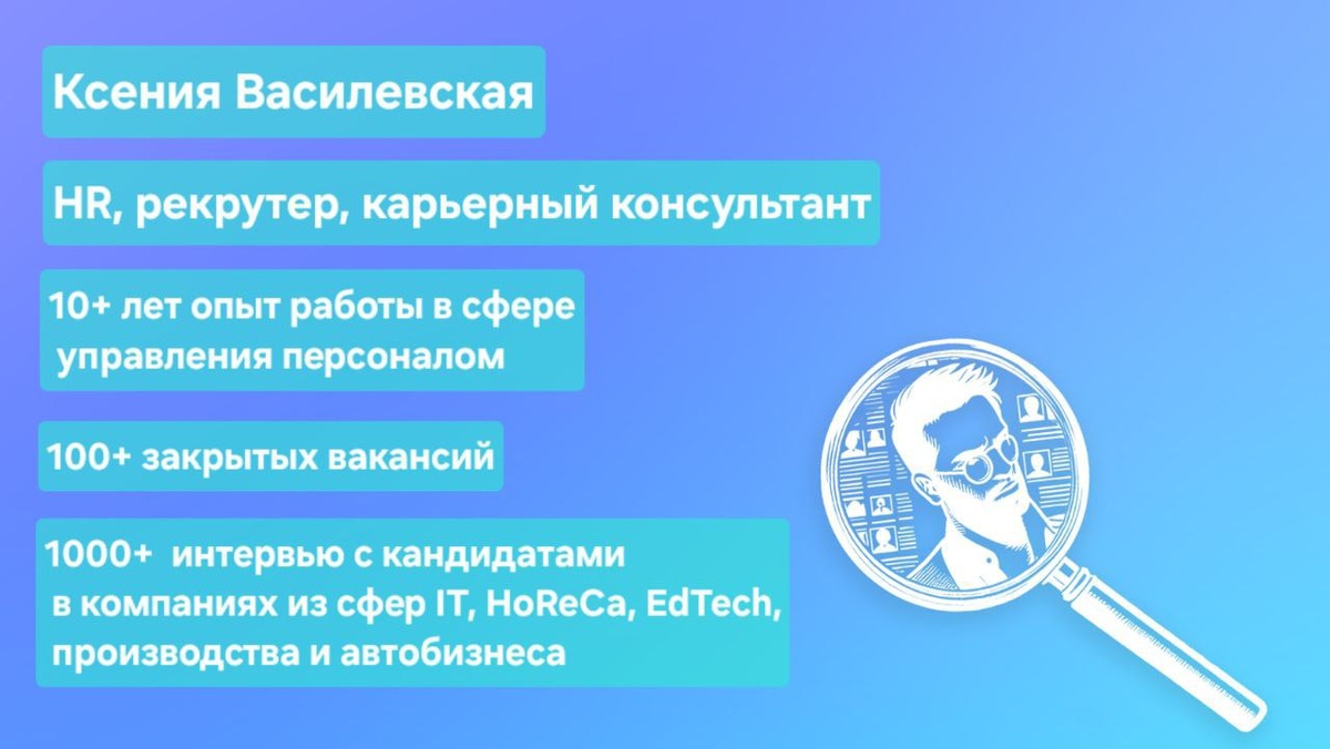 Друзья, привет 🙌🏻 На связи Ксения. Хочу напомнить, что ведущее направление моей работы – это рекрутинг. Если у вас есть потребность в поиске сотрудника, и вы готовы делегировать эту задачу внешнему специалисту, то готова помочь. Много лет занимаюсь подбором персонала и знаю, как важно найти не просто «подходящего по резюме», а того, кто реально подойдет под задачи и вольется в команду. Провожу полный цикл подбора: от снятия заявки до оффера и выхода кандидата на работу. В каких нишах работаю: 👨🏼💼Менеджмент (менеджеры среднего звена и топ-менеджеры) 🧑🏻💼 Административный персонал 👨🏻💻 IT-специалисты Работаю, как самозанятая. Условия подбора обсуждаются индивидуально. Если вы в поиске сотрудника — напишите мне @kseniavasilevskaya
