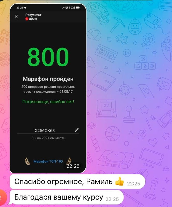 Ответил на все 800 вопросов ПРАВИЛЬНО! Вот таким результатом на днях поделился наш ученик, в чате с Обратной связью 🔥 И на самом деле это очень круто! Решить ВСЕ 800 вопросов ПДД без единой ошибки! 💡 Поэтому важно не только учить билеты, но еще периодически их решать Мы ведем для вас телеграм канал с тестами ПДД (такие же, как в билетах) и с полезными теоретическими блоками, что бы вы сразу же могли проверять ваши знания на практике! 👉 Обязательно подпишитесь, тесты выходят каждый день: https://t.me/+yio0t0RarHU0NDQ6 ⚡️ А что бы ваш результат был таким же, как на фото, готовьтесь к экзамену с помощью нашего курса "Разборов билетов ПДД": kappasov.ru/razbor