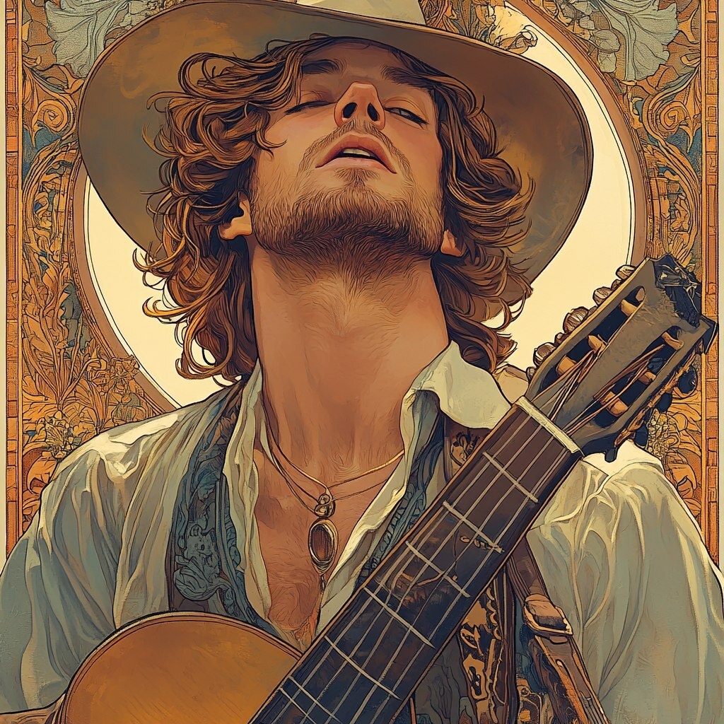 Создано на основе запроса: musicien chanteur dans le style indiana jones, illustration pour chasse au trésor, à la manière d’Alphonse mucha