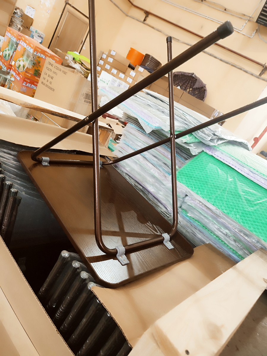 Складной туристический стол отечественного производства. Размеры 46х62х68 см. Зато можно выбрать расцветку столешницы, которая изготовлена из ЛДСП. (Не путать с ЛДПР!)) Ножки металлические. Столик вполне тяжелый, такой ветром на пикнике или даче не сдует.