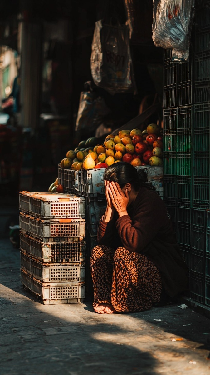 Создано на основе запроса: heartbroken street vendor woman kneeling in front of her empty stall, hands on her face, crying, shadows of fruit