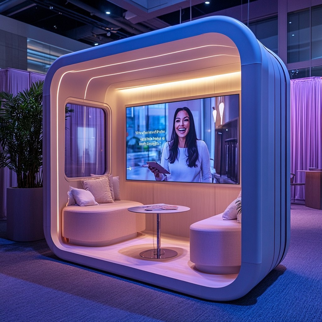Создано на основе запроса: A sleek and modern video booth at an indoor company event, where a large screen inside the booth shows a