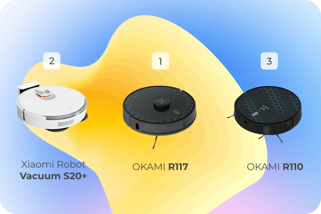 Интриги, кто окажется в первой тройке, немного: самые популярные производители у всех на слуху. Первое место взял Okami R117 — у него очень высокая мощность для робота-пылесоса, много полезных функций, да ещё и сборка отличная, чем немногие могут похвастаться.