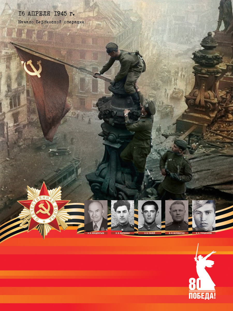 #Победа80 80 лет назад — 16 апреля 1945 года — в ходе Великой Отечественной войны началась Берлинская стратегическая наступательная операция. К началу апреля 1945 года советские войска вышли к центральным районам Германии и находились в 60 — 70 километрах от ее столицы. Гитлер всеми силами старался задержать продвижение Красной армии. На берлинском направлении находились 3-я танковая и 9-я армия группы армий «Висла», 4-я танковая и 17-я армия группы армий «Центр», авиация 6-го воздушного флота и воздушного флота «Рейх». В состав этой группировки вошли 48 пехотных, четыре танковые и десять моторизованных дивизий, 37 отдельных полков и 98 отдельных батальонов, два отдельных танковых полка, другие соединения и части видов вооруженных сил и родов войск. Всего — около 1 миллиона человек, 8 тысяч орудий и минометов, свыше 1200 танков и штурмовых орудий, 3330 самолетов. К проведению Берлинской операции Ставка Верховного главнокомандования Советской армии привлекла войска 2-го и 1-го Белорусс