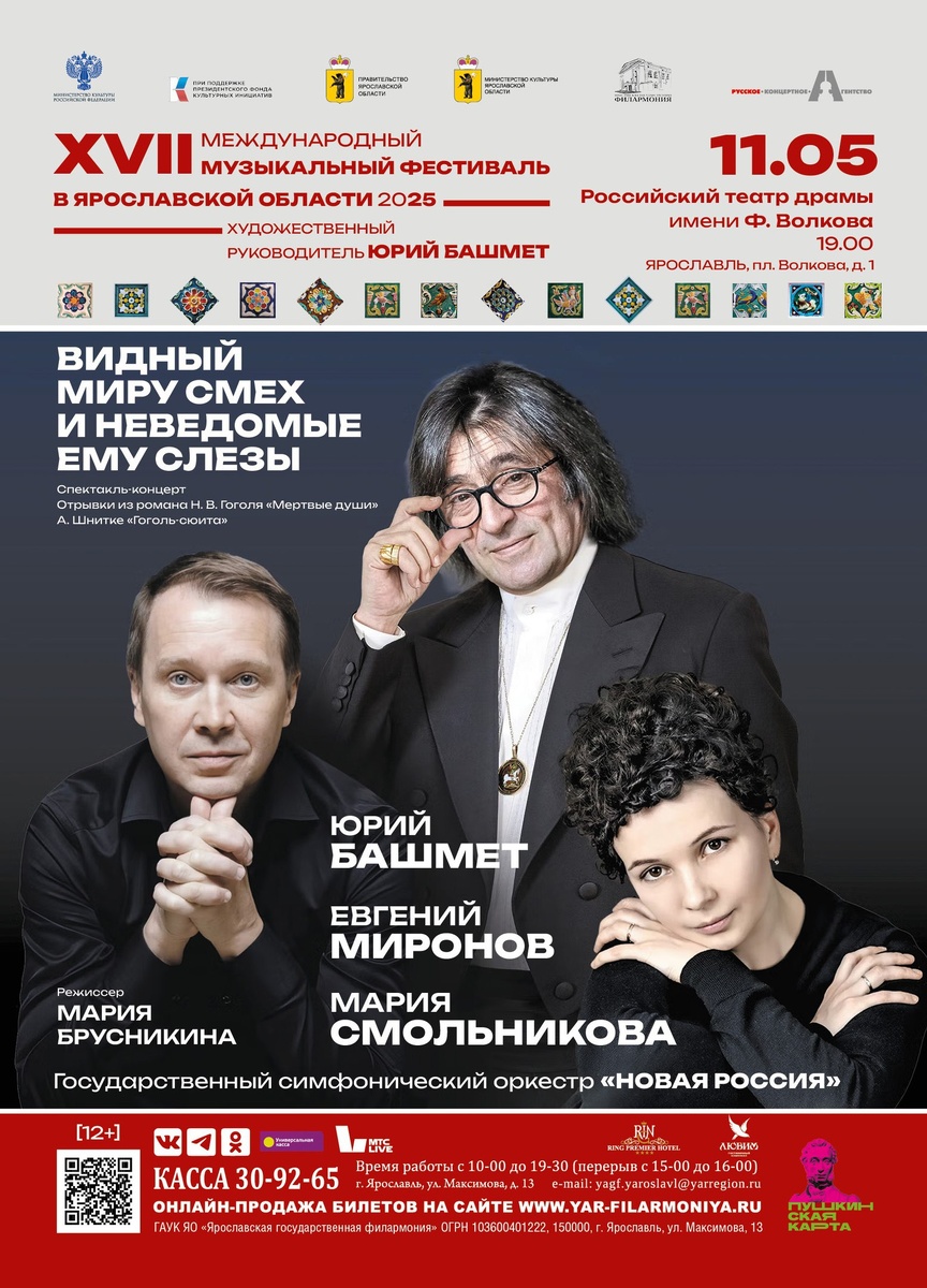 11 мая 2025 г. в 19:00 приглашаем на спектакль-концерт «Видный миру смех и неведомые ему слезы», который состоится в театре драмы им. Ф. Волкова в рамках XVII Международного музыкального фестиваля Юрия Башмета. https://clck.ru/3LF55w В исполнении Государственного симфонического оркестра «Новая Россия» под руководством Юрия Башмета прозвучат «Гоголь-сюита» Альфреда Шнитке и фрагменты поэмы Николая Гоголя «Мертвые души». В спектакле-концерте примут участие выдающиеся мастера театра и кино народный артист РФ Евгений Миронов и двукратный лауреат премии «Золотая маска» Мария Смольникова. Режиссер – Марина Брусникина. Музыка Альфреда Шнитке невероятно точно отражает парадоксальность, юмор, глубину и самобытность гоголевского текста, а выбранные специально для этого спектакля части оригинального текста поражают своей эксцентричностью, свежестью и современностью. Наследие Николая Васильевича Гоголя всегда интересовало Шнитке. К творчеству вел Показать полностью... https://yar-filarmoniya.ru/a