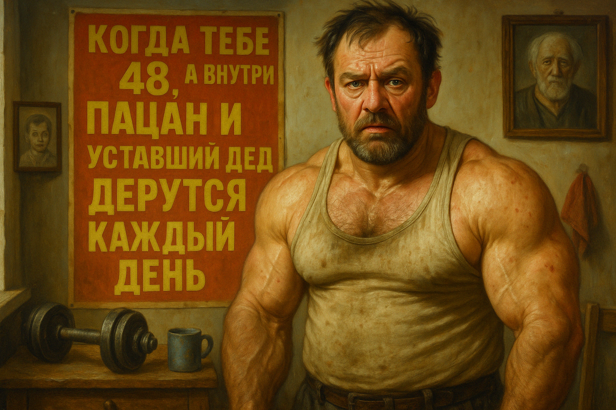 А в это время внутри орёт другой — тот самый, который в 20 прыгал с гаражей, сжирал три пиццы и не поправлялся. И начинается драка. Каждый божий день. Мне реально 48. Я обычный, без понтов, пузо есть, сила вроде тоже где-то прячется.