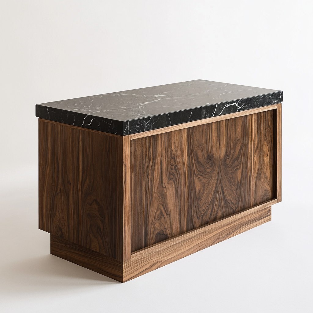 Создано на основе запроса: walnut wood small island counter with black marble top, white background studio shoot, minimalist, modern