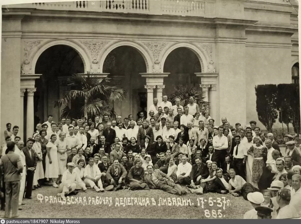 Французская рабочая делегация в Ливадии, 1937, Крым. Рабочий человек, в любой стране мира, всегда остается самим собой - кормильцем, пахарем, трудягой. У таких людей отсутствуют языковые барьеры, ведь достаточно лишь крепкого рукопожатия крепких мозолистых трудовых рук, чтобы без всяких слов узнать своего коллегу.