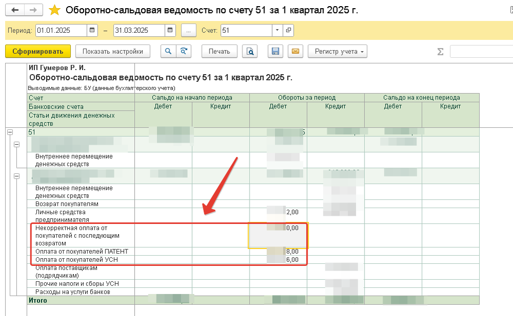 Добрый день, коллеги! Длительное время я работал только на УСН (Доходы): оказывал услуги (программировал на 1С и консультировал по работе в 1С) и продавал лицензии. С недавних пор дополнительно подключил Патент по виду деятельности "Разработка компьютерного программного обеспечения..." В итоге сейчас услуги по 1С налогооблагаются по Патенту, продажи лицензий и сервисов 1С - по УСН. В связи с этим, при очередном подсчете налогов по УСН, пришлось придумывать удобный способ учета оплат по разным видам деятельности. ИП на УСН Доходы используют кассовый метод расчета налога - то есть налог считаем по всем входящим платежам, кроме ошибочных. Собственно, способ простой - раньше для расчета налога по УСН я использовал ОСВ по счету 51 - так и осталось сейчас. Настроил только разделение оплат по статьям движения денежных средств - смотрите рисунок ниже. Дальше будут описаны подробности и детали ведения подобного учета. Отбираем загруженные выписки - только входящие, то есть сумма поступления бо