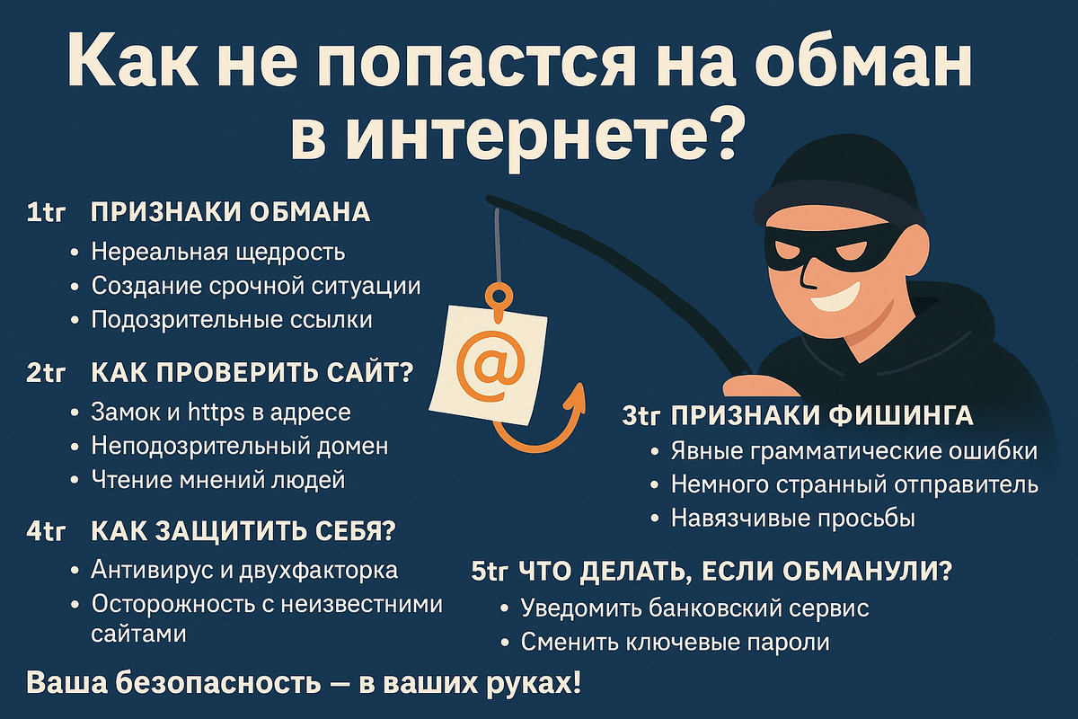 Ну что тут сказать — в сети, как и в жизни, доверчивость может дорого обойтись. Письма от «банка», сайты с «подарками», звонки от «службы поддержки» — всё это может оказаться не тем, чем кажется. И хотя всё это звучит немного страшновато, на самом деле разобраться в защите проще, чем кажется. Поехали по шагам. Часто всё начинается с чего-то банального. Вот вам пришло письмо, где якобы служба доставки просит подтвердить данные. Или в ленте всплывает объявление с распродажей по 90% — и понеслась. Типичные трюки мошенников: История с улиц интернета: Марина соблазнилась на красивую сумку за копейки. Перевела деньги — и всё, магазин растворился. На глаз отличить оригинал от подделки порой непросто. Но вот на что стоит обратить внимание: Совет в двух словах: не кликайте — вбейте адрес сами. Звучит как банальность, но именно простые меры работают лучше всего: Даже если вы уже клюнули — не всё потеряно. Главное — действовать сразу: Было дело: Олег купил билет на "супер-распродаже". Успел замет