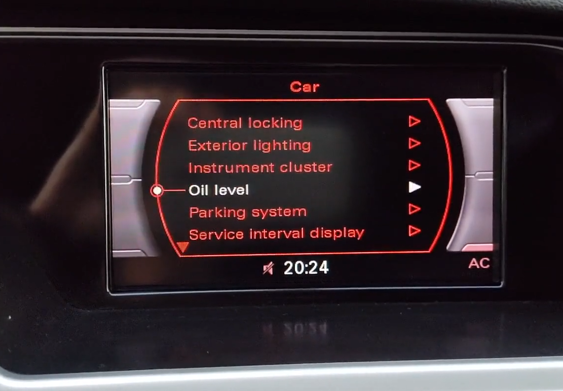 Для этого нужно нажать кнопку "Car" и выбрать пункт "Oil level". Этот вариант покажет уровень масла только прогретого двигателя и после 2-5 минут после остановки. Информация подгружается с датчика уровня масла не сразу же, поэтому для более точного результата лучше пользоваться следующим вариантом. Если сказано "There is currently no information available on the engine oil level" - тогда нужно попробовать проверить позже, либо температура масла слишком низкая. Для этого двигатель так же должен быть прогрет до рабочей температуры и пройти 2-5 минут после остановки. Чтобы уровень масла отобразился нужно открыть водительскую дверь и капот, после включения зажигания (без запуска двигателя) на экране появится текущий уровень масла. В некоторых случаях требуется еще нажать кнопку Reset на подрулевом переключателе. Этот вариант может быть полезен только в случае, когда хочется проверять уровень масла при запущенном двигателе и более точно следить за жором масла. В моём случае я подключался к