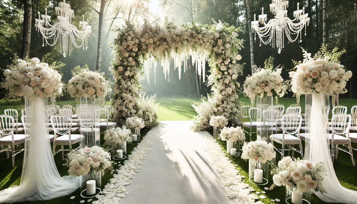 Идеальная свадьба — это не просто день, это чувство. Лёгкое, чистое, как первое дыхание утра. Именно такую атмосферу мы создаём в концепции «Воздушной элегантности», где главную роль играют белоснежные цветы, изысканный минимализм и свет. Под сенью деревьев, где солнечные лучи пробиваются сквозь листву, размещена арка из белых цветов, утопающая в гортензиях, пионовидных розах, ранункулюсах и дельфиниуме. Проход к ней выложен лепестками и обрамлён прозрачными стойками с каскадными цветочными композициями. Никаких лишних акцентов — только стекло, свет и белый цвет. Простота, граничащая с благородством. Эта скульптура из сладкого вдохновения — трёхъярусный торт, украшенный тонкими цветочными узорами, напоминающими кружево. Белоснежные сахарные пионы и ранункулюсы спадают вдоль уровней, создавая лёгкую текстуру. Без кричащих деталей — только вкус и эстетика. Букет — отражение невесты. Здесь он лаконичный, утончённый, собран из миниатюрных белых роз, ранункулюсов и нежных бутонов. Обёрну