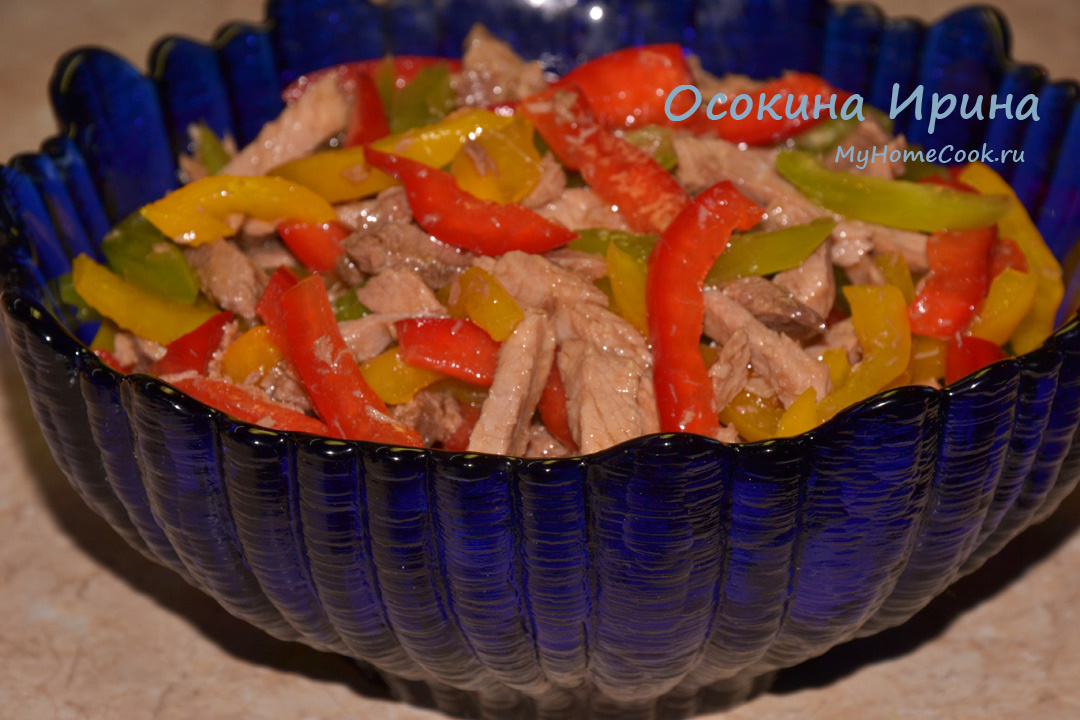 Подобные салаты мой супруг очень любит за мясо, а я - за обилие овощей. Итак, с утра порезала брусочком 400 г отварной телятины, добавила по 1 небольшому красному, жёлтому и зелёному перцам брусочком. В пиалке смешала 3 ст.л. оливкового масла, 1 ст.л. соевого соуса, 1 ст.л. яблочного уксуса, 1 ч.л. без верха сахара и соль вкусу и подвзбила, заправила салат, промешала и убрала на несколько часов в холодильник подмариноваться. Очень вкусно! Мировой закусон) Приятного аппетита