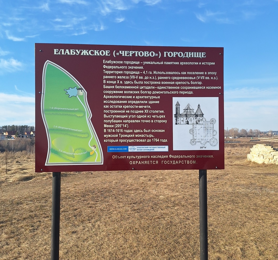 Переезд к Чертову городищу, 15 минут на нашем микрике, и мы на месте. Чeртово городище расположилось на берегу реки Камы, из себя представляет остатки укрепленного поселения, родовое убежище племен, которые обитали в этих местах во второй половине первого тысячелетия нашей эры. Отсюда прекрасно просматриваются подходы и с воды, и с суши – отличное место для оборонительного сооружения. Но первое, что нас встречает вначале пути в городище - это Площадь Тысячелетия и памятник основателю Елабуги Ибрагиму эмиру. Авторы памятника — М. Гасимов, Ф. Халиков, М. Максудов. Памятник установлен на высоком берегу в месте впадения реки Тоймы в Каму в 2007 году в честь 1000 летия Елабуги. Абу Исхак Ибрагим ибн Мухаммад или Ибрагим эмир правитель Волжской Булгарии. Во времена его правления 1006-1026 гг, территория Волжской Булгарии была расширена на восток. Ибрагим эмир основал восточно-болгарский торговый и военный центр — город Елабуга. По преданию, здесь, на отвесном берегу, тысячу лет назад, воткну