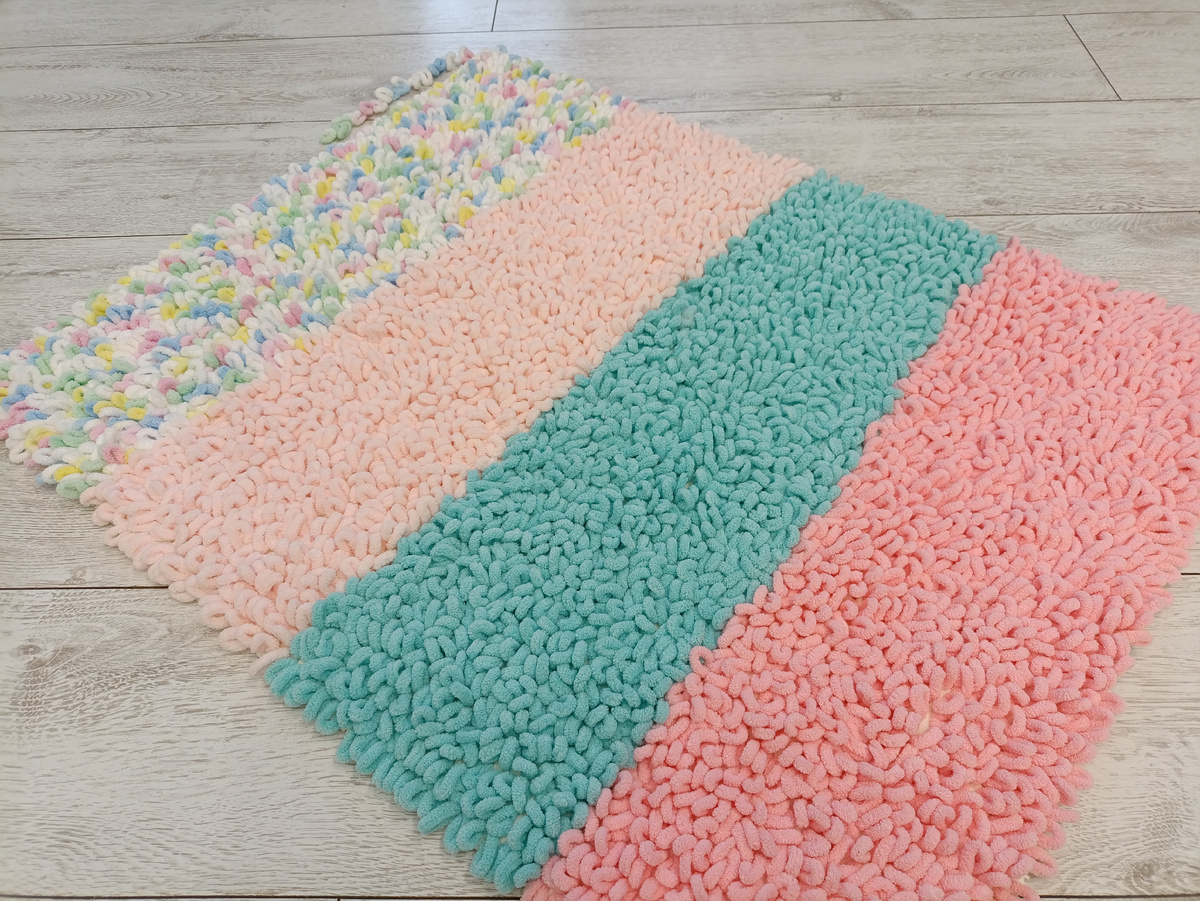 Проект, который был задуман давно, а создан спустя года 2. В спешке. Конечно, на выходе я получила совсем не то, что задумывала. А все потому, что работать с маленьким ребенком - не самая простая задача. Давайте расскажу о том, как коврик должен был выглядеть. Я прикупила Ализе Пуффи Файн нежных пастельных оттенков, чтобы избежать излишней пестроты. Рисунок... Вместо прямоугольников должны были быть треугольники с разными сторонами. Хотела предварительно расчертить основу и... Работать в свое удовольствие! На деле получилось так: я вся в мыле под тихое сопение младенчика сражалась в этим ковром! Честно говоря, ковер получился классный. Мы его используем. Ребенок шалит в нем своими ручками (а это именно то, ради чего все и затевалось). Но повторить подвиг я бы не смогла! Основа - резиновый коврик (такие продаются в строительных магазинах на отрез). Белой (изнаночной) стороной вверх, рисунком вниз. Есть специальные основы под ковер, но в них слишком большие дырочки, петли из них вылетаю
