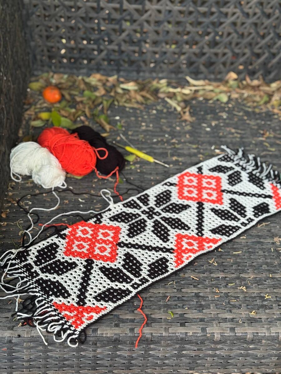 Неплохо, неплохо, очень даже. И не так муторно, как я думала. Это я про два цвета в одном ряду. Но нет, интарсия — не мое. Много клубков, я отвыкла от висящих мотков, которые остаются после окончания ряда. Резать, резать, не дожидаясь перитонита, как говорили в «Покровских воротах». Вот мой рукодельный девиз.