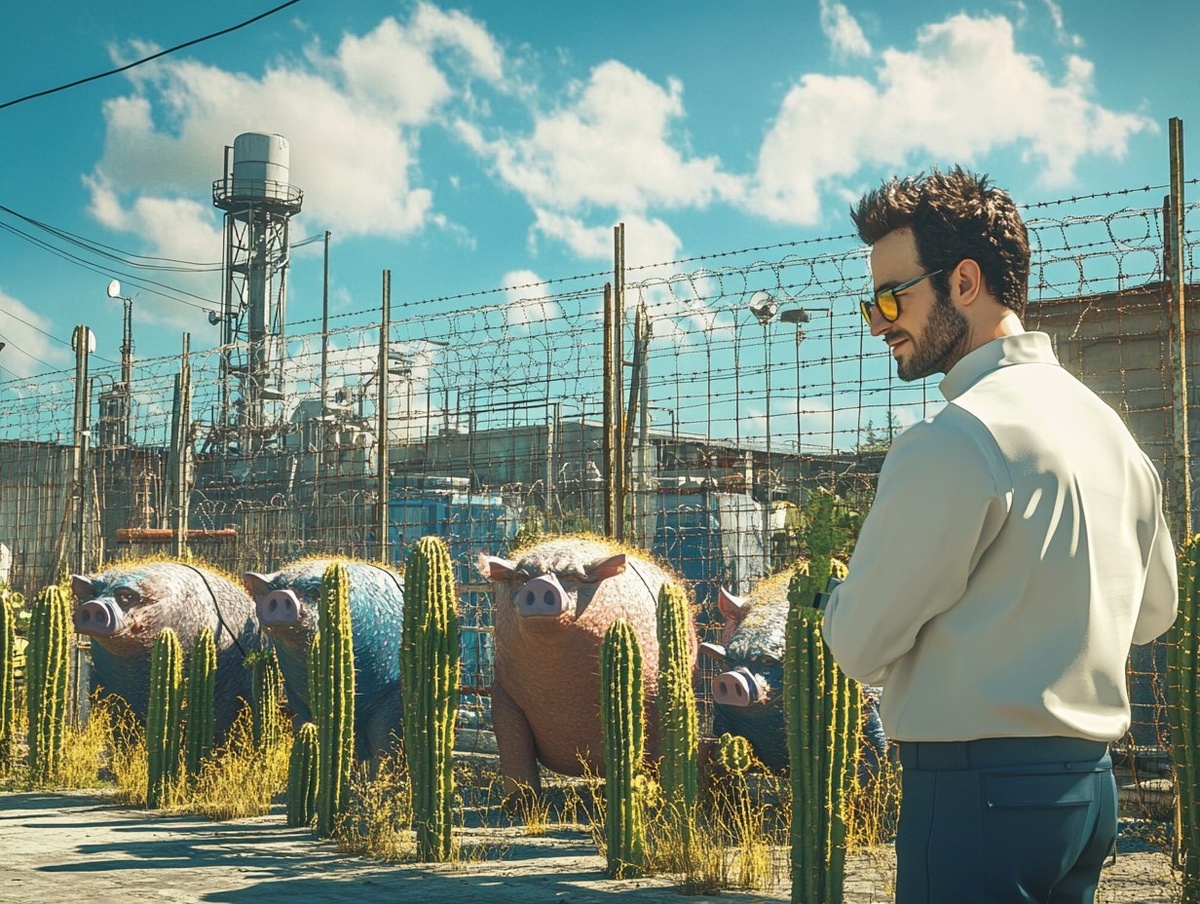 Создано на основе запроса: a brightly lit photograph of ten half pig half cactus creatures that are green, red, blue, purple, and yellow and come in different sizes. A scientist is standing in the middle of them. There is a barbed wire fence around them. There is an industrial building in the background. Sunny sky with a few clouds. Sony A65 camera. --- Автоперевод: Ярко освещенная фотография десяти полувигентных существ, которые являются зелеными, красными, синими, фиолетовыми и желтыми и бывают разных размеров. Классно выглядит? 🤔 https://dzen.ru/id/65c0c65c86e4f837c27b24d7 #ИИ #AI #нейросеть #midjourney #art