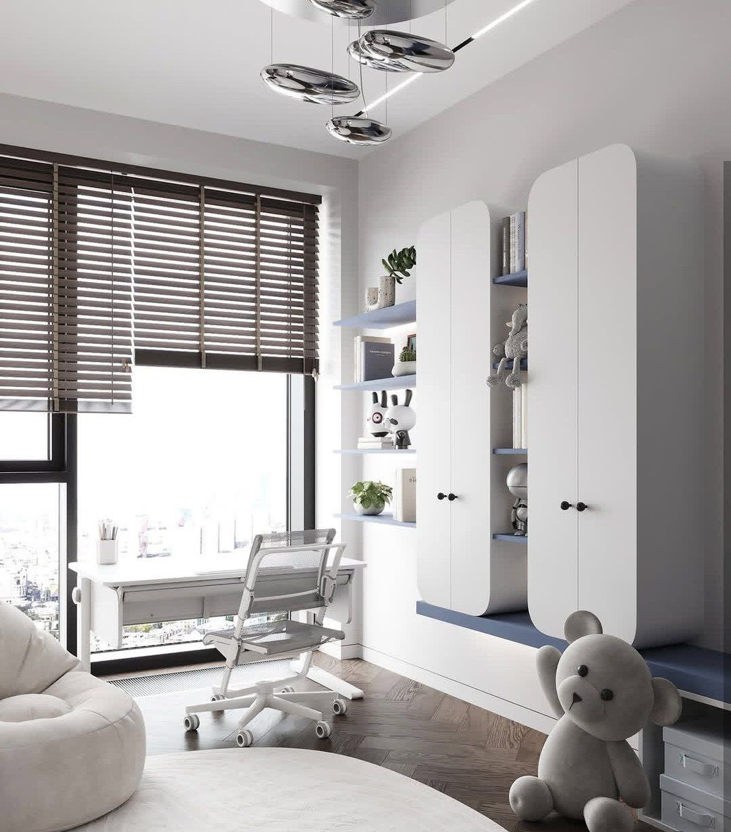 🌿 Уютное гнездышко для маленького исследователя Белоснежные стены этой детской создают идеальный чистый фон, на котором синие акценты — как яркие всплески радости. Яркие полочки, участок стены цвета летнего неба, дверцы шкафа с нежным голубым оттенком — каждый элемент будто дышит свежестью и свободой. У кровати — компактный столик для любимых машинок и книг о приключениях. Рабочая зона у окна, залитая солнечным светом, приглашает творить и учиться. Ничего лишнего — только самое необходимое, аккуратно разложенное по своим местам. Но главное сокровище комнаты — уютное кресло в виде большого плюшевого мишки. В его мягких объятиях так здорово мечтать, читать сказки на ночь или просто прятаться от всего мира. Хотите создать такое же воздушное пространство для своего малыша? Напишите, какие элементы вам особенно понравились — наши дизайнеры помогут воплотить мечты в жизнь! #детскаядляодного #детскаядляребенка #детскаядлямальчика