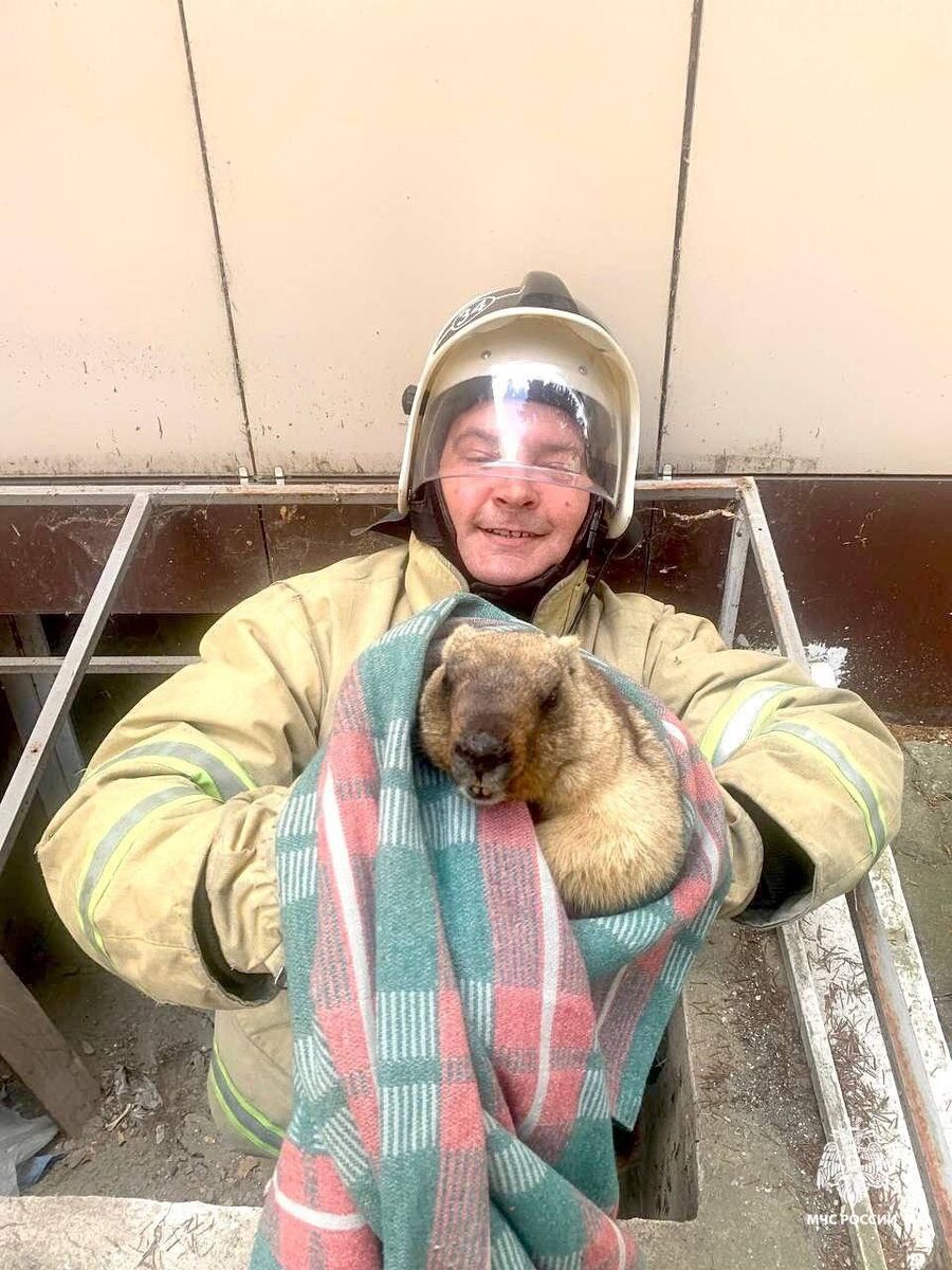 В поселке Ровеньки пожарные спасли сурка-байбака Местный обитатель степей забрёл на территорию населенного пункта и угодил в глубокую яму. Самостоятельно выбраться из неё у маленького зверька не было никаких шансов. Попавшего в беду сурка заметили жители поселка, которые и обратились за помощью к сотрудникам МЧС России. Огнеборцы спустились к пострадавшему, аккуратно обмотали в одеяло и подняли на поверхность. Зверёк совсем не пострадал и оказавшись на свободе сразу же отправился по своим делам. ❕ Жесть Белгород - подписаться