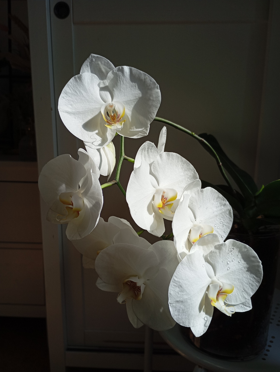 Белоснежка 🦢 Полный роспуск 🤍 Первое домашнее цветение на 9 цветочков диаметром по 10.5 см, в вазе на 2.5 литра. Цветёт и растит новый лист 🚀 Макароша любезно согласилась наглядно продемонстрировать масштаб цветения 😺 #БелыйФаленопсис #БелаяОрхидея #Орхидеивцвету #Нацвело