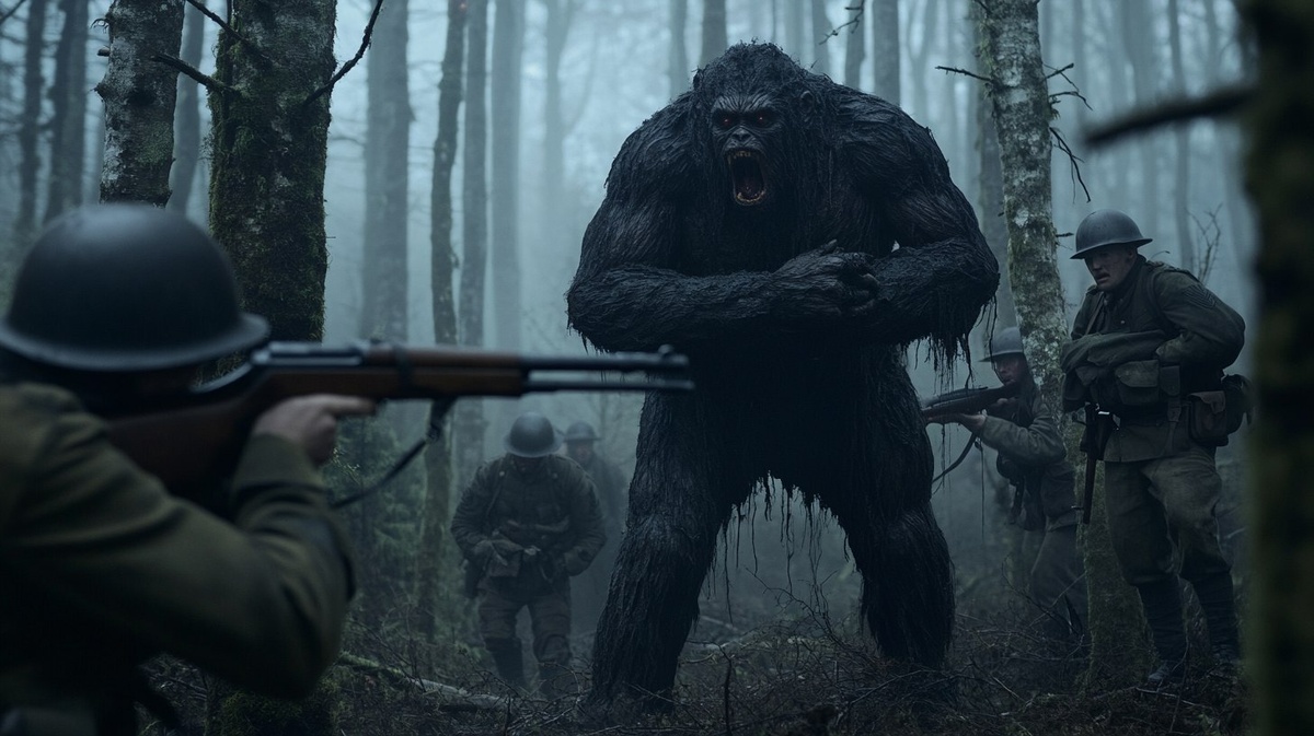 Создано на основе запроса: A dark, misty forest in eastern France during World War I. A group of frightened soldiers in worn French military uniforms aim their rifles into the trees. Emerging from the shadows is a terrifying creature its body large and twisted like a deformed gorilla, with long, thin arms dragging on the ground. Its skin is dark, slimy, and cracked, covered in patches of dried black fluid. Its eyes are disturbingly human, glowing faintly with rage and sorrow. The atmosphere is thick with suspense no birds, no sound, just silence and fear. A red light bleeds faintly through the mist above, hinting at a supernatural presence. The creature stares at the soldiers, half-hidden behind trees, as if deciding whether to attack. Cinematic, realistic style, high detail, horror tone. --- Автоперевод: Темный, туманный лес на востоке Франции во время Первой мировой войны. Как тебе иллюстрация? 🤔 https://dzen.ru/id/65c0c65c86e4f837c27b24d7 #ИИ #AI #нейросеть #midjourney #art