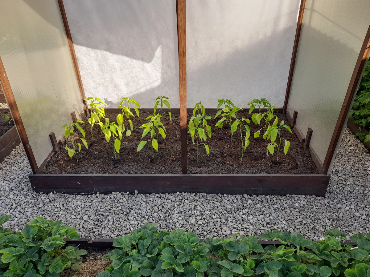 Перцы и огурцы в открытом грунте мы выращиваем под укрытием. 4 года назад сделали мини-теплички и очень ими довольны. Укрывной материал защищает растения от холодного весеннего ветра, от обжигающих летних солнечных лучей и от росы в конце огородного сезона. Под укрытием не так быстро испаряется вода, поэтому не надо часто поливать. При этом укрывная ткань пропускает воду, и растения поливаются во время дождя. Спустя 4 сезона мини-тепличка для огурцов вышла из строя. Подгнили бруски, которые граничили с землей и конструкция из-за большой парусности дала крен. Зимой мы пытались выправить завал, вкрутив еще саморезы, но этот метод не сработал. Сильным ветром корпус мини-теплички завалило на другой край, да так что поликарбонат на торце разорвало шпалерой для малины. Пришло время заняться ремонтом. Сняли поликарбонат, раскрутили бруски. У вертикальных стоек отрезали гнилую часть и 20 см бруска болгаркой утоньшили до внутренних размеров металлической трубы сечением 20х40 мм. Все бруски ко