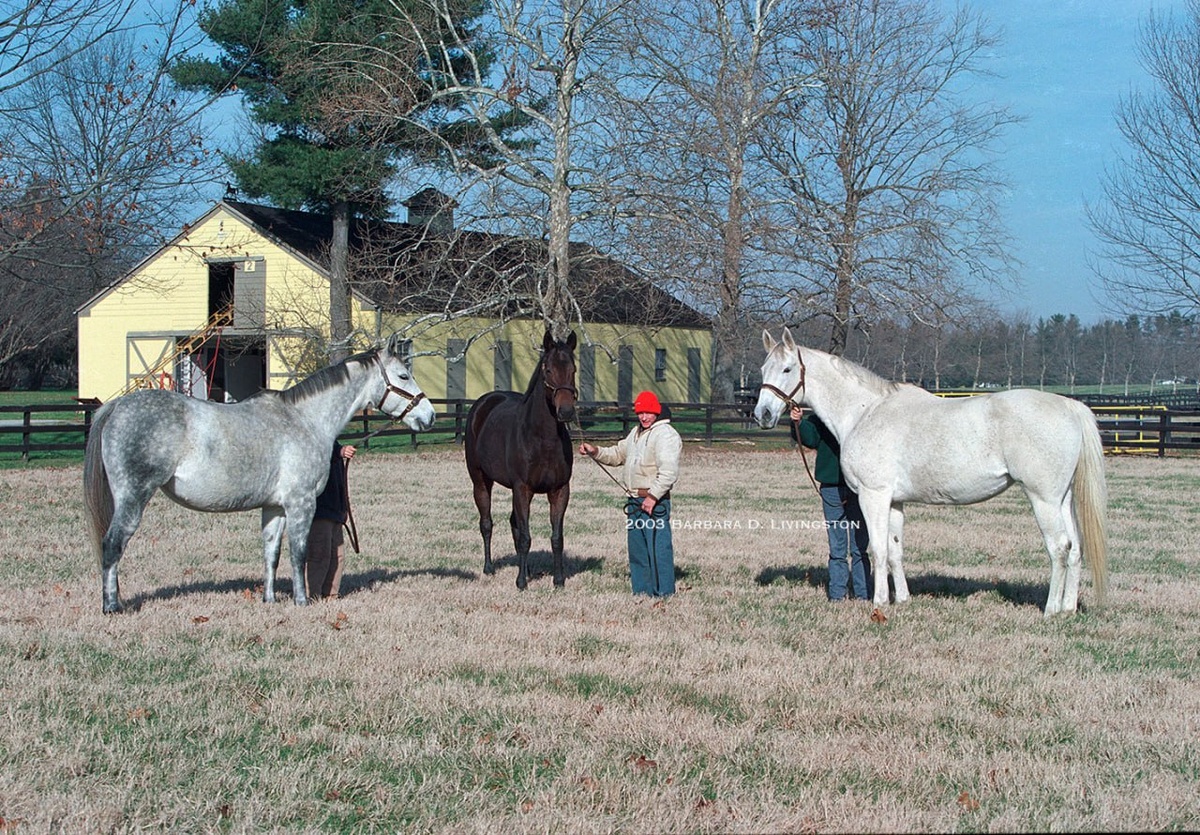 Shiner (справа) с дочерьми MG1W Shine Again (Лошадь года, выведенная в Мэриленде в 2003 году) и G2W Shiny Band