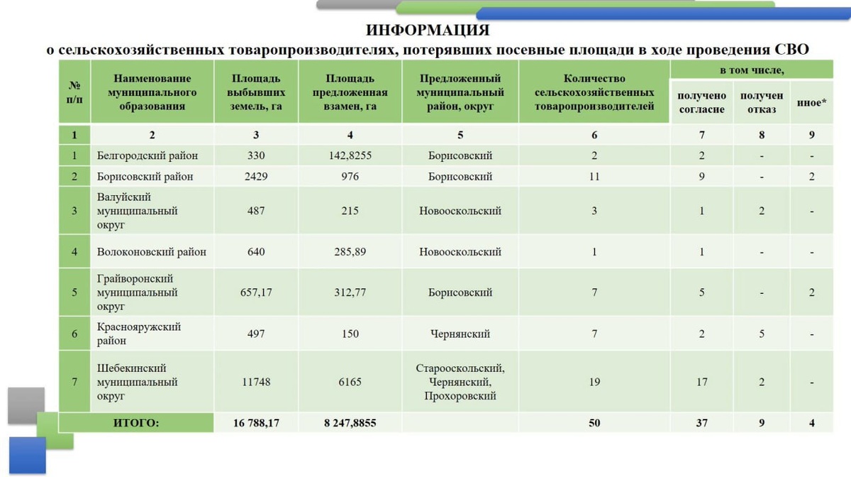37 аграриев, лишившихся земли из-за атак ВСУ, начали посевную на новых пашнях Общая площадь выбывших земель составила 16,8 тыс. га, площадь предложенных взамен сельхозугодий - 8, 2 тыс га. Новые наделы предоставляют в Борисовском, Чернянском, Прохоровском районах, Старооскольском и Новооскольском округах. Из 50 сельхозпроизводителей, потерявших землю из-за оперативной обстановки, 37 уже получили новые участки и начали сев, рассказал замгубернатора Рустэм Зайнуллин. Девять человек отказались от предложенных вариантов, а четверо предпочли решать вопрос самостоятельно. «Понимаем, проблема с дефицитом земли – она очевидна, земли свободной её физически нет. Вопрос сложный, но очевидно, что он решаемый. Человек должен понимать, что, если он попадает в сложную ситуацию, ему будет оказана помощь. Не на уровне отчёта чиновника, а на уровне оценки со стороны пострадавших», – прокомментировал ситуацию Вячеслав Гладков. Подписаться на нас|Предложить новость