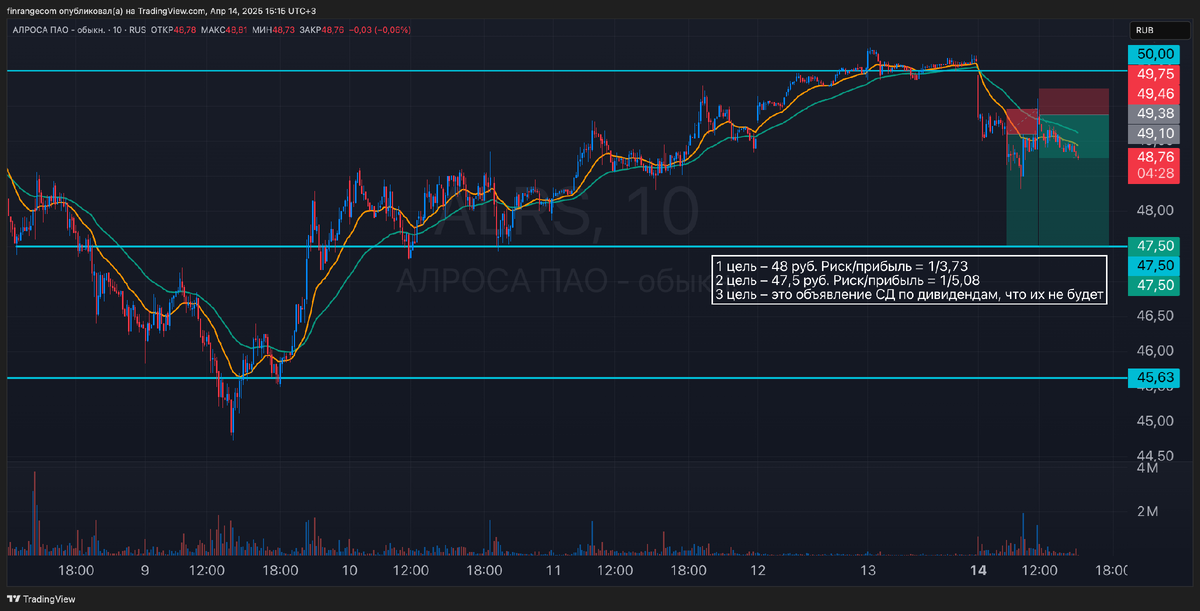 Именно это и произошло сегодня со мной. С утра открыл в спекулятивном портфеле короткую позицию в акциях АЛРОСА в ожидании объявлении результатов по дивидендам после заседания совета директоров. Днём меня вынесли по стопу на фоне импульса в акциях Сбера, когда дёрнули весь рынок. Пришлось переоткрывать шорт, но уже с другими параметрами.