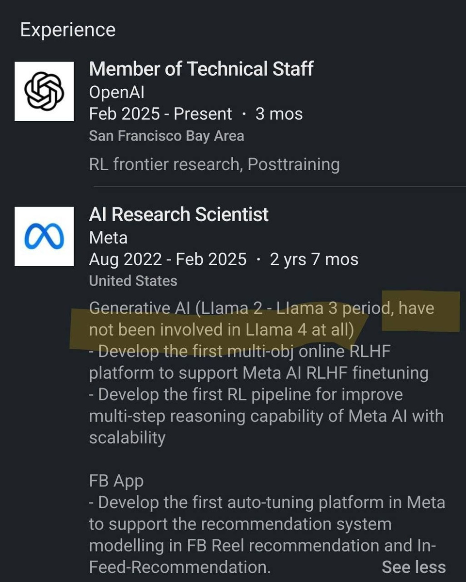 В ответ на пост Бывшие сотрудники Meta* специально подчёркивают, что не участвовали в разработке Llama-4. Когда выпустили настолько крутой продукт, что от него лучше показательно дистанцироваться. *компания признана экстремистской и запрещена в России