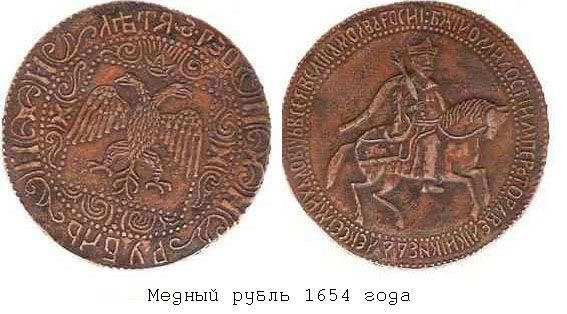 Однажды, 16 апреля 1663 года, царь Алексей Михайлович по прозванию «Тишайший» решил узаконить безобразие, которое почти десять лет творилось в экономике. Москва, середина XVII века. Идет очередная война с Польшей. Для войны же, как через 200 лет скажет Наполеон, нужны три вещи: деньги, деньги и ещё раз деньги. Но вот как раз денег в русской казне хронически не хватало. И тут рождается гениальная (на первый взгляд) идея: «А давайте чеканить деньги… из меди!». Не то чтобы использование меди было новостью. Вообще к тому времени веками использовали два металла. Золотые монеты (червонцы) чеканили редко – в основном для наград или внешней торговли. Простой народ их в руках не держал. Основные же монеты: копейки, деньги (½ копейки), полушки (¼ копейки) – чеканили из серебра. Беда была в том, что своего серебра на Руси не было, оно завозилось из Западной Европы. И уже само это создавало дефицит. Медными же были совсем мелкие деньги, нужные для размена. Вместо дорогого серебра с 1654 года поти
