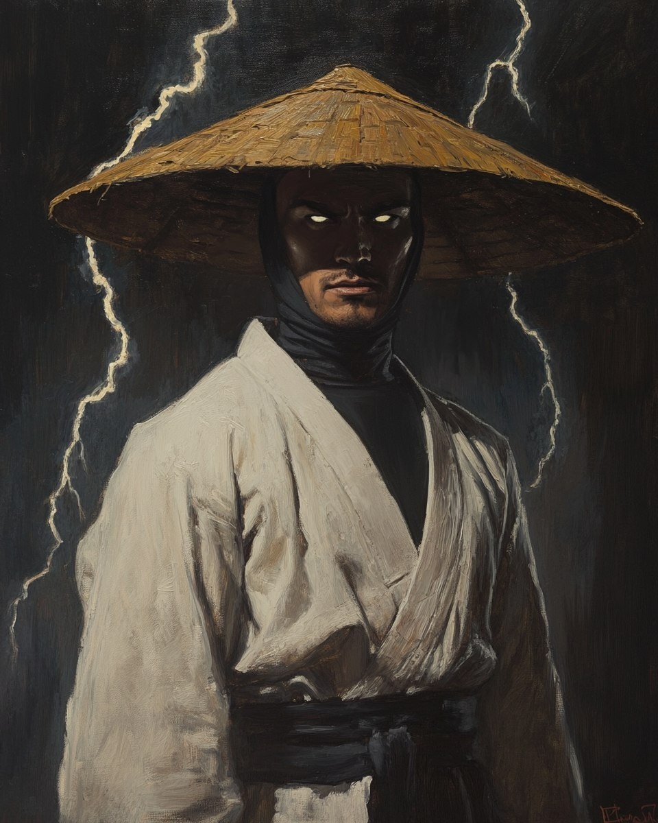 Создано на основе запроса: oil painting portrait by edward hopper of Raiden, god of thunder, raiden from mortal kombat 3, lightning, straw