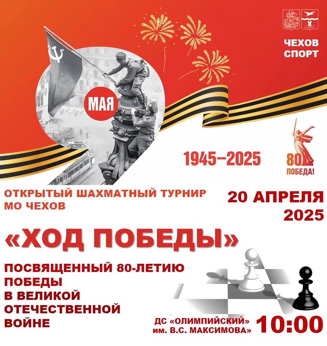 ✨ Шахматный турнир «Ход Победы» 🧑🧑🧒 Возрастные группы: • open-турнир (все возраста)(блиц) • дети (2011 г.р. и моложе)(рапид) В детском турнире будет разделение на 3 возрастные группы: • 2011-2013 гг.р. • 2014-2016 гг.р. • 2017 г.р. и моложе ⏱️Контроль времени: • 3 мин + 2 сек (open-турнир)(блиц) • 10 мин + 5 сек (детский)(рапид) Кол-во туров: 7-9 туров Участие в турнире бесплатное! Ждем вас в холле 4 подъезда ‼️Онлайн регистрация доступна по ссылке - https://forms.yandex.ru/u/67d5900d90fa7b9f74213e40/ ‼️Регистрация в 9:30 ‼️ Начало 1 тура - в 10:00. 📆 20.04.2025 🕛 09:30 🏢 ДС «Олимпийский» им. В. С. Максимова 📍 г. Чехов, ул. Полиграфистов, стр.30 #webЧехов ✅ Мероприятия Чехов https://dzen.ru/id/66cc4b48e9ef144699238a51 http://vk.com/chekhov_events http://dzen.ru/chekhov_events