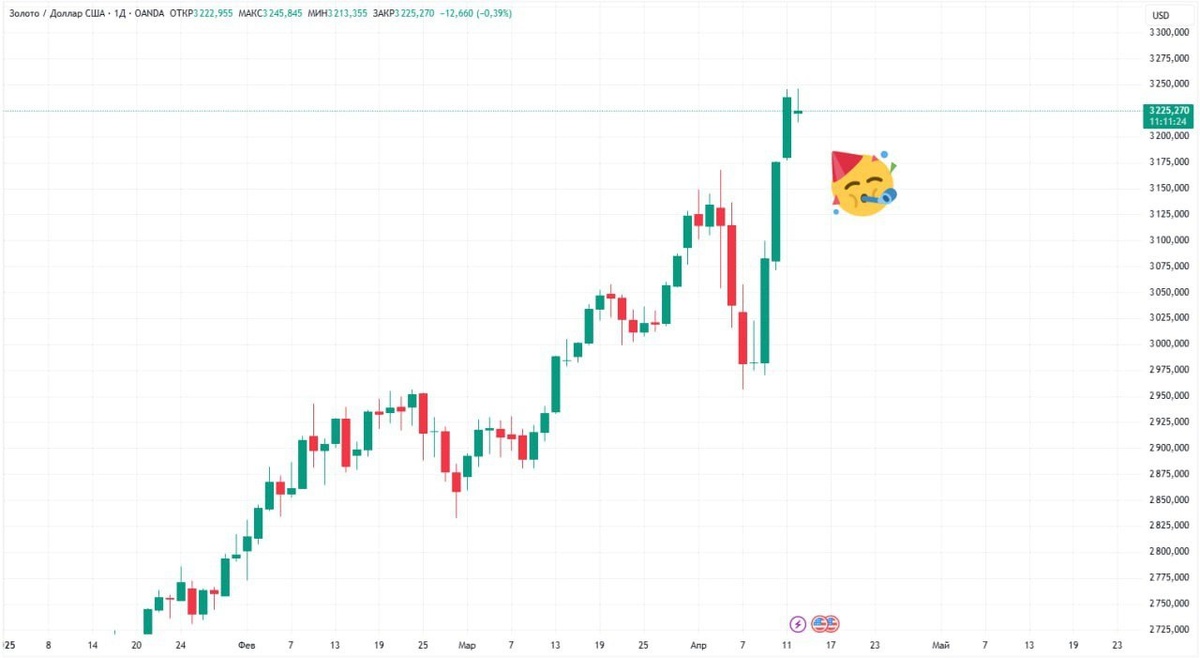Золото может вырасти до $3 700 к концу года 🌞 Драгоценный металл продолжает обновлять АТН – $3 245. Аналитики из Goldman Sachs считают, что золото вырастет до $3 700 за счет спроса Центробанков и бегства инвесторов из доллара. Максимальная неопределенность на рынках может запампить золото до $4 500.