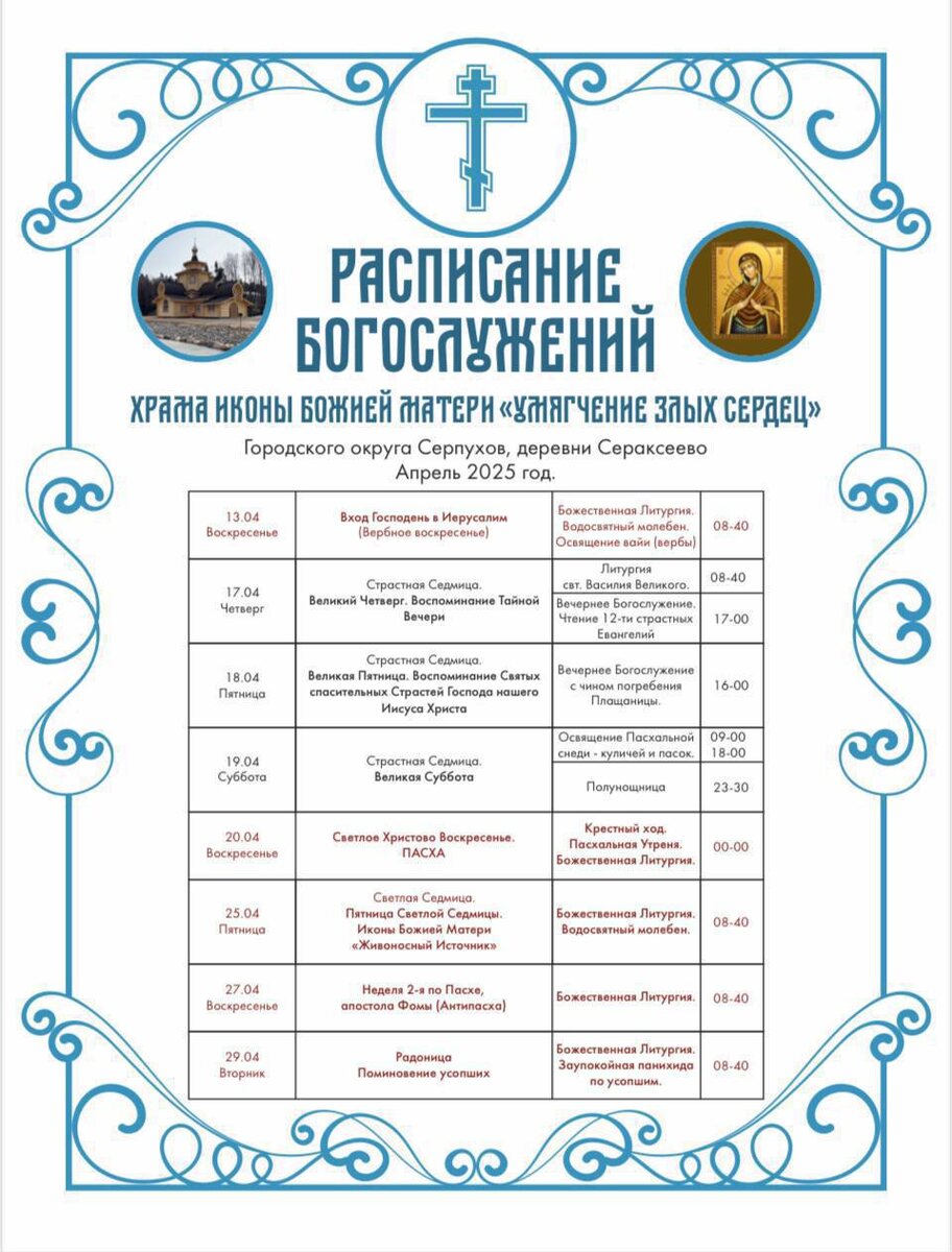 Перед светлым праздником Пасхи в храме в Сераксеево будет находиться икона Божией Матери «Умягчение злых сердец» Икона будет на службах Страстной недели: с 16:00 в пятницу, в субботу — весь день и на Пасхальной службе в воскресенье до самого вечера. Приходите! 🙏 Пусть Божья благодать будет с вами!